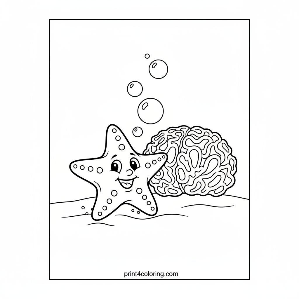 #starfish#ocean#reef#underwater#sea-creatures#marine-life#coral#bubbles#sandy-seafloor#easy-coloring#coloring-page#printable