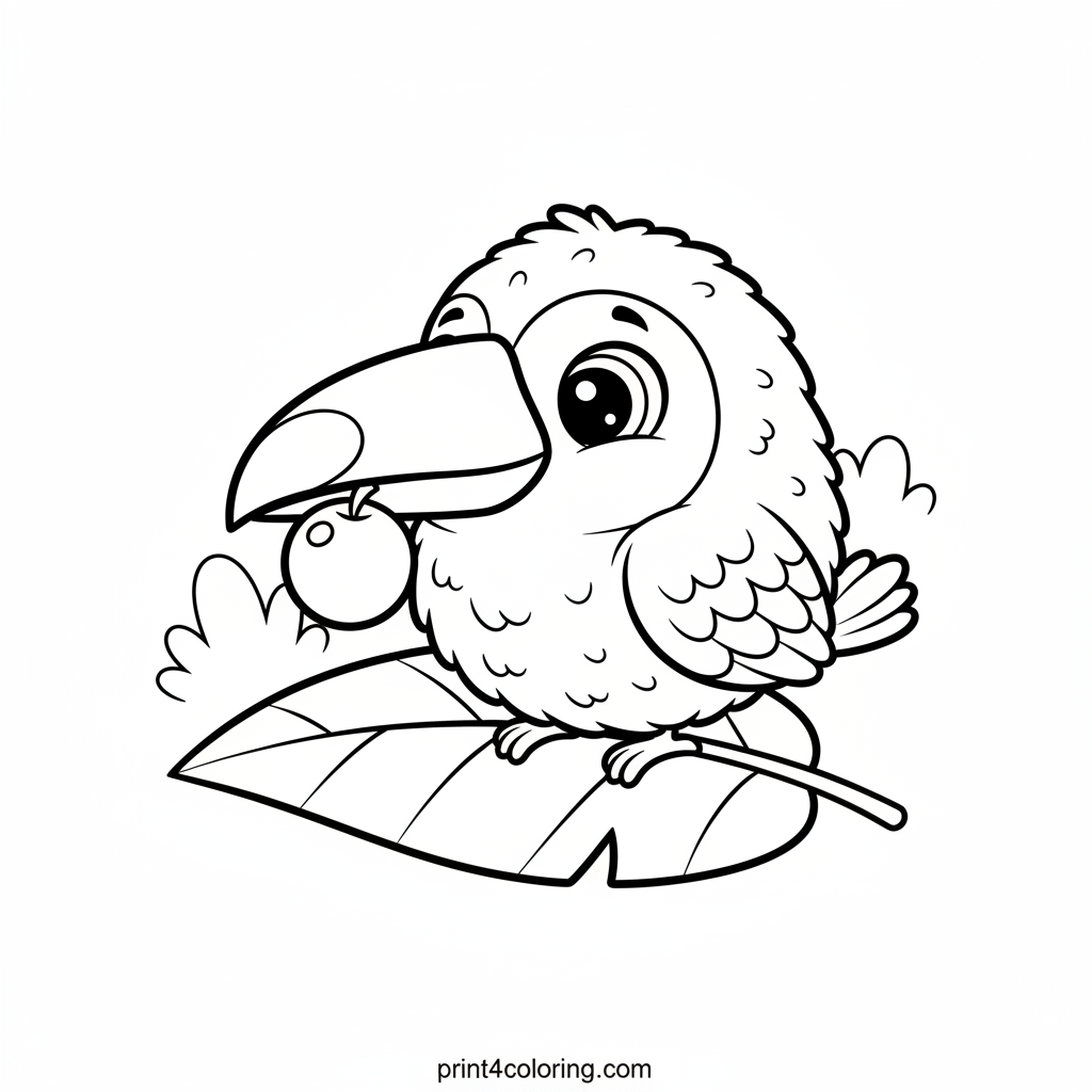 Join a very fluffy, round baby toucan as it discovers the joy of its first juicy berry! With big, friendly eyes and an adorable oversized beak, this little bird is carefully pecking at a delicious treat on a vibrant green leaf. A delightful scene perfect for young artists to bring to life with bright colors.