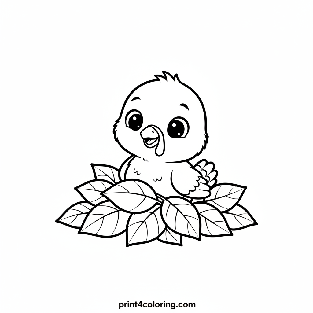 Get ready for an adorable autumn adventure! This coloring page features a super cute baby turkey, fluffy and small, with big, curious eyes, playfully peeking out from a vibrant pile of fallen autumn leaves. Imagine the beautiful colors you can use to bring this cozy fall scene to life! It's a delightful picture for little artists.