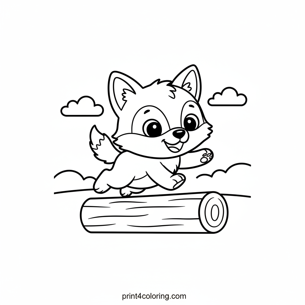 Get ready for a wild adventure with this adorable little wolf! Watch as it bounds joyfully over a smooth log, paws reaching and ears alert. With a happy grin on its face, this energetic pup invites you to bring its playful spirit to life with your favorite colors. A perfect scene for young artists!