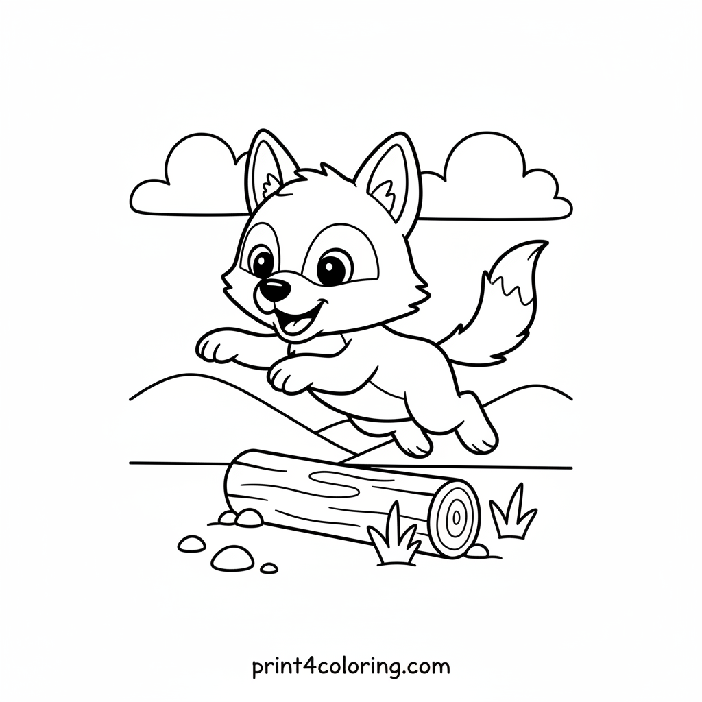 Meet a super cute and energetic wolf pup caught mid-air! With a happy grin and paws outstretched, this little adventurer is having a blast leaping over a smooth log in the forest. Add vibrant colors to its fluffy fur and the natural world around it. A joyful scene waiting for your artistic touch!