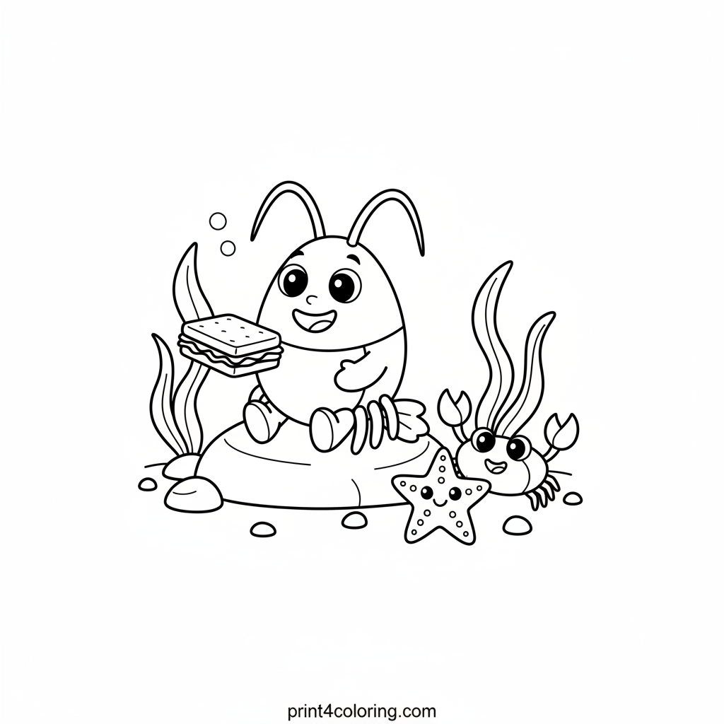 Dive into a delightful underwater scene where a friendly lobster hosts a special picnic! See our happy lobster sharing a yummy seaweed sandwich with a smiling starfish and a cheerful little crab. This heartwarming picture celebrates friendship and fun beneath the waves, perfect for little artists to bring to life with vibrant colors.