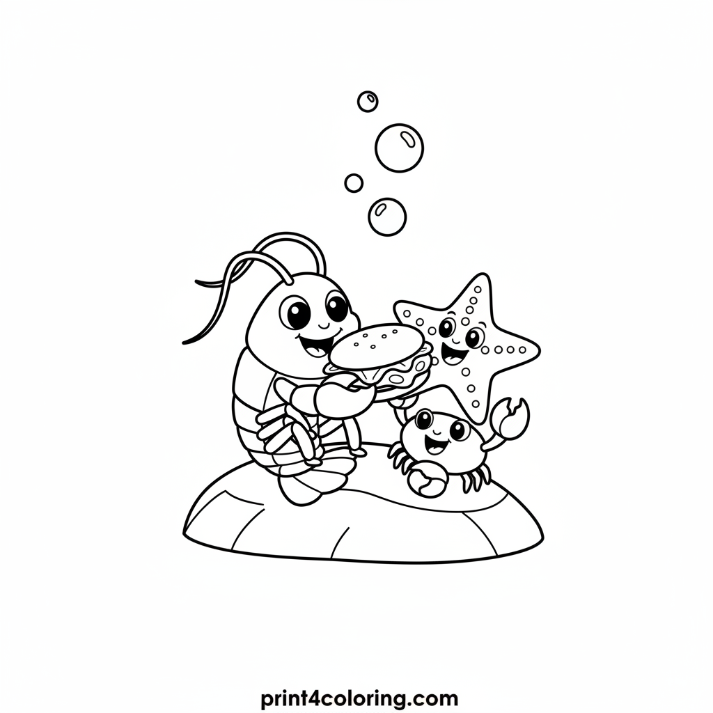 Dive into a delightful underwater picnic scene! A friendly lobster is sharing a yummy seaweed sandwich with his pals, a cheerful starfish and a happy little crab, all sitting on a comfy rock. Bring this bubbly ocean feast to life with your brightest colors and join their fin-tastic fun!