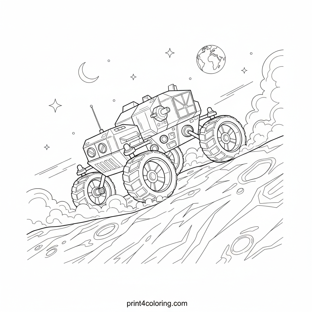 Blast off with this epic coloring page! A powerful lunar rover confidently ascends a steep, rocky crater wall on the moon. Its detailed wheels kick up stylized dust trails, revealing intricate patterns on the lunar surface. Spot the distant stars and a beautiful crescent Earth in the background.