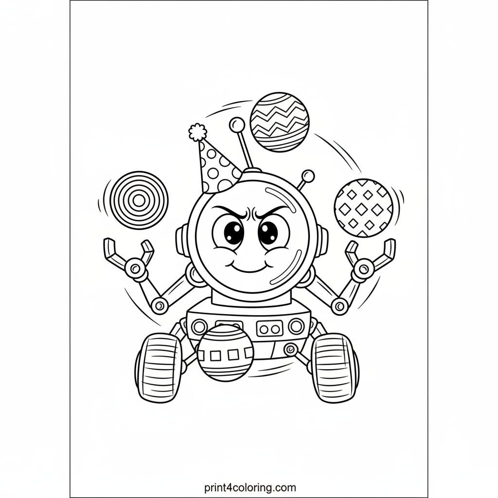 Get ready for some out-of-this-world fun! This close-up coloring page features a hilarious lunar rover, complete with a tiny party hat, showing off its incredible juggling skills. Watch as its robotic arms expertly toss patterned moon rocks high into the air, all while sporting a super concentrated expression. A cosmic challenge for your crayons!