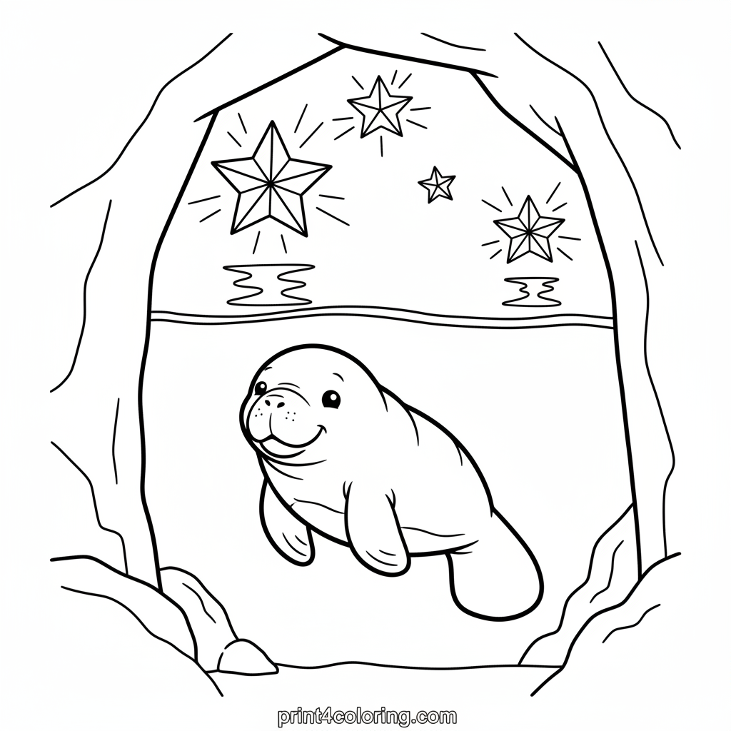 #manatee#underwater#stars#cavern#ocean#sea-life#marine#glowing#magical#coloring-page#printable