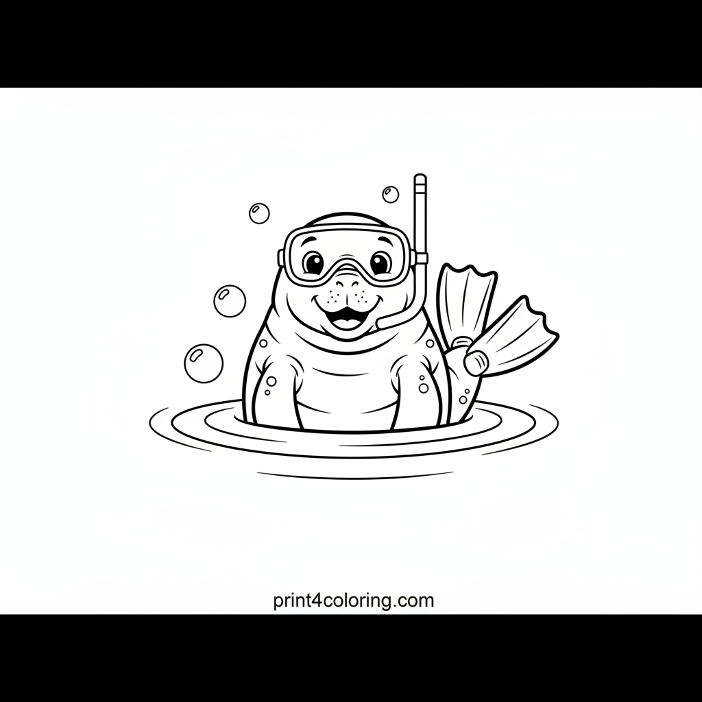 Dive into a bubbly adventure with our cheerful manatee! This gentle giant is sporting a funny snorkel mask and bright flippers, peeking curiously from the water's surface. What amazing sights will it discover? Grab your crayons and bring this adorable underwater explorer to life!