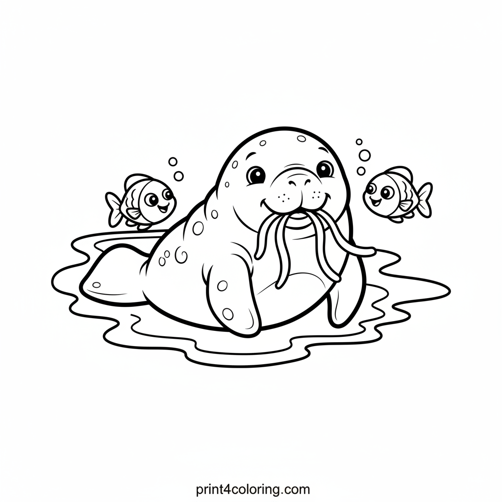 Dive into the gentle depths where a happy manatee enjoys its favorite meal! Watch as this friendly sea cow peacefully munches on delicious seagrass, surrounded by tiny, colorful fish swimming by. It's a serene underwater scene, perfect for bringing to life with your favorite colors.