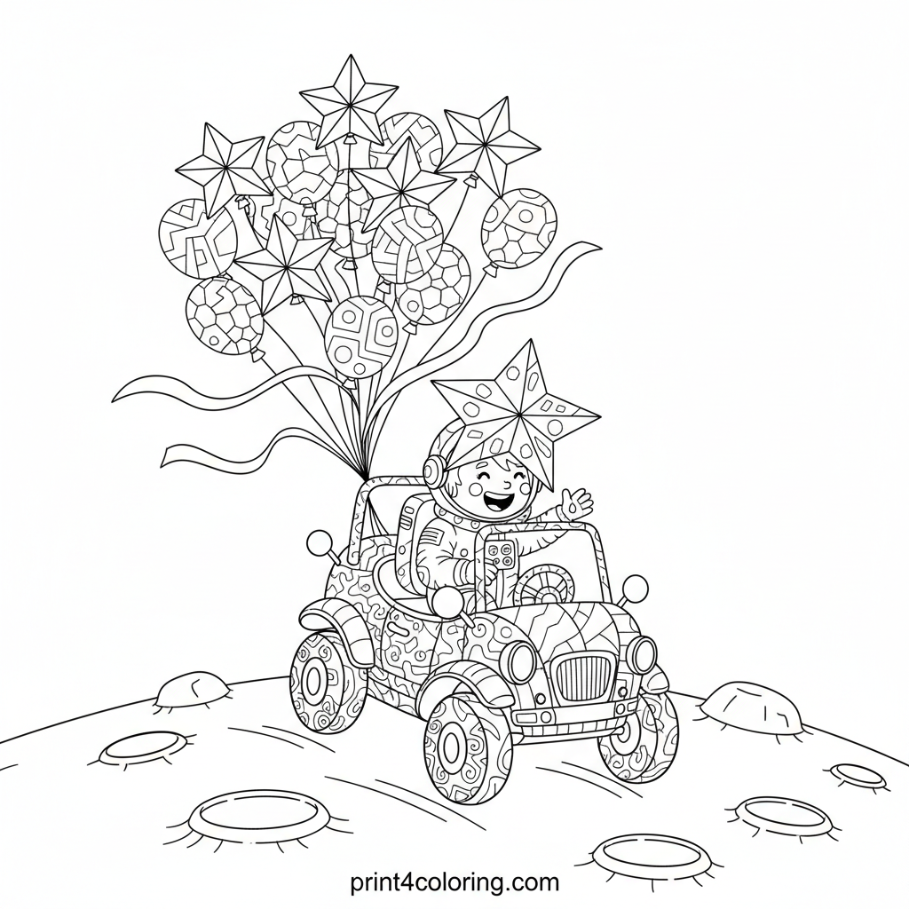 Blast off into fun with our Zero-G Party Parade! This whimsical moon buggy, transformed into a space party bus, floats across the lunar surface. An astronaut with a star-shaped helmet bounces comically amidst gravity-defying balloons and streamers. Get ready to add vibrant colors to this out-of-this-world celebration, perfect for creative abstract coloring!