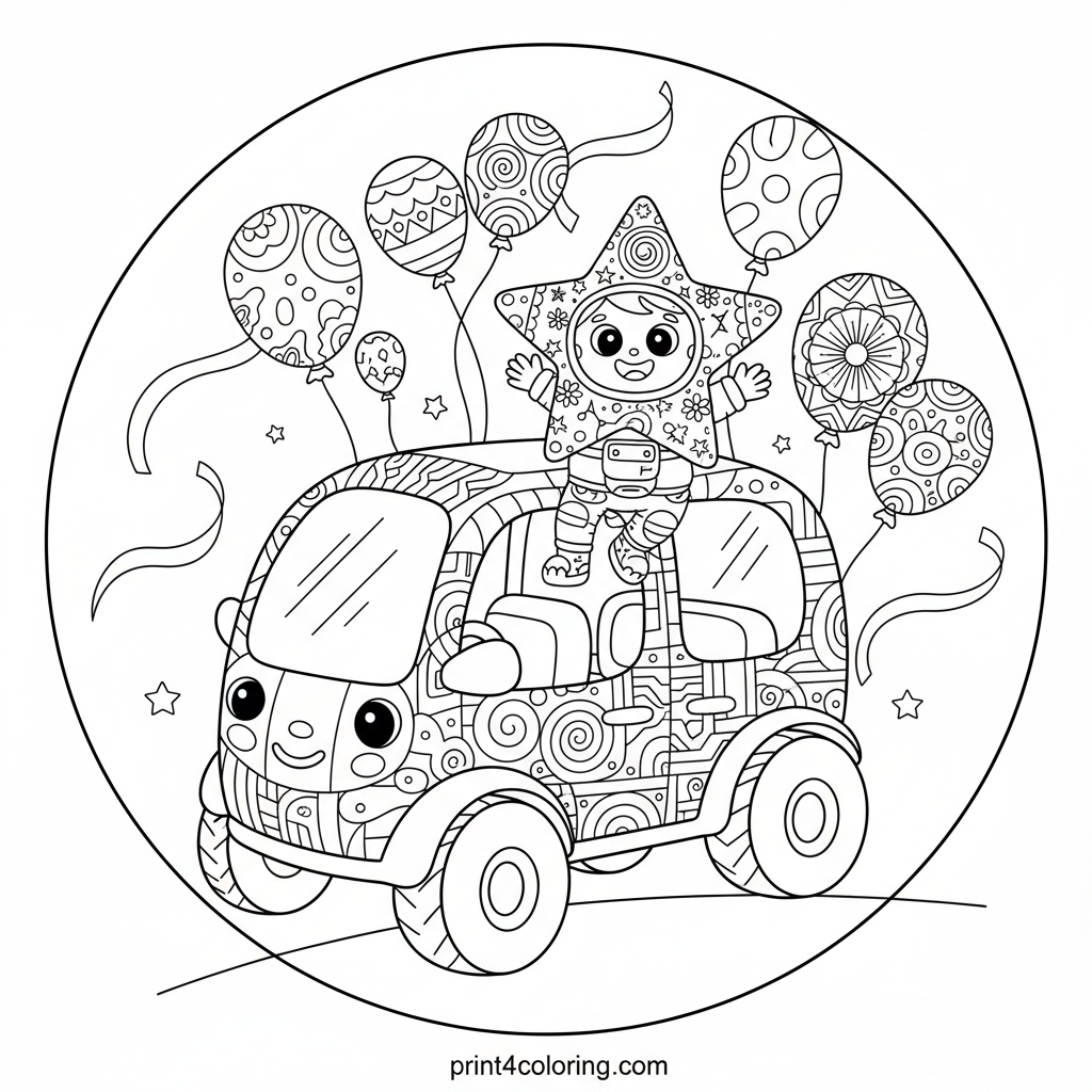 Imagine a delightful moon buggy transformed into the ultimate space party bus! Adorned with whimsical, gravity-defying balloons and streamers, it carries a joyous astronaut in a star-shaped helmet. Watch them bounce playfully across the lunar surface, inviting you to add vibrant, abstract colors to this zero-G celebration!