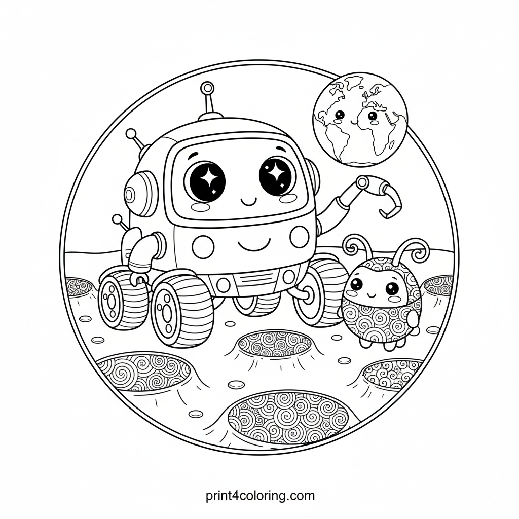 A friendly lunar rover with big, happy 'eyes' smiles as it extends an arm to greet a tiny, intricately patterned moon-rock creature with antennae. Explore a charming moonscape filled with stylized craters and a distant, beautiful Earth. This cozy scene invites you to color a cosmic friendship!