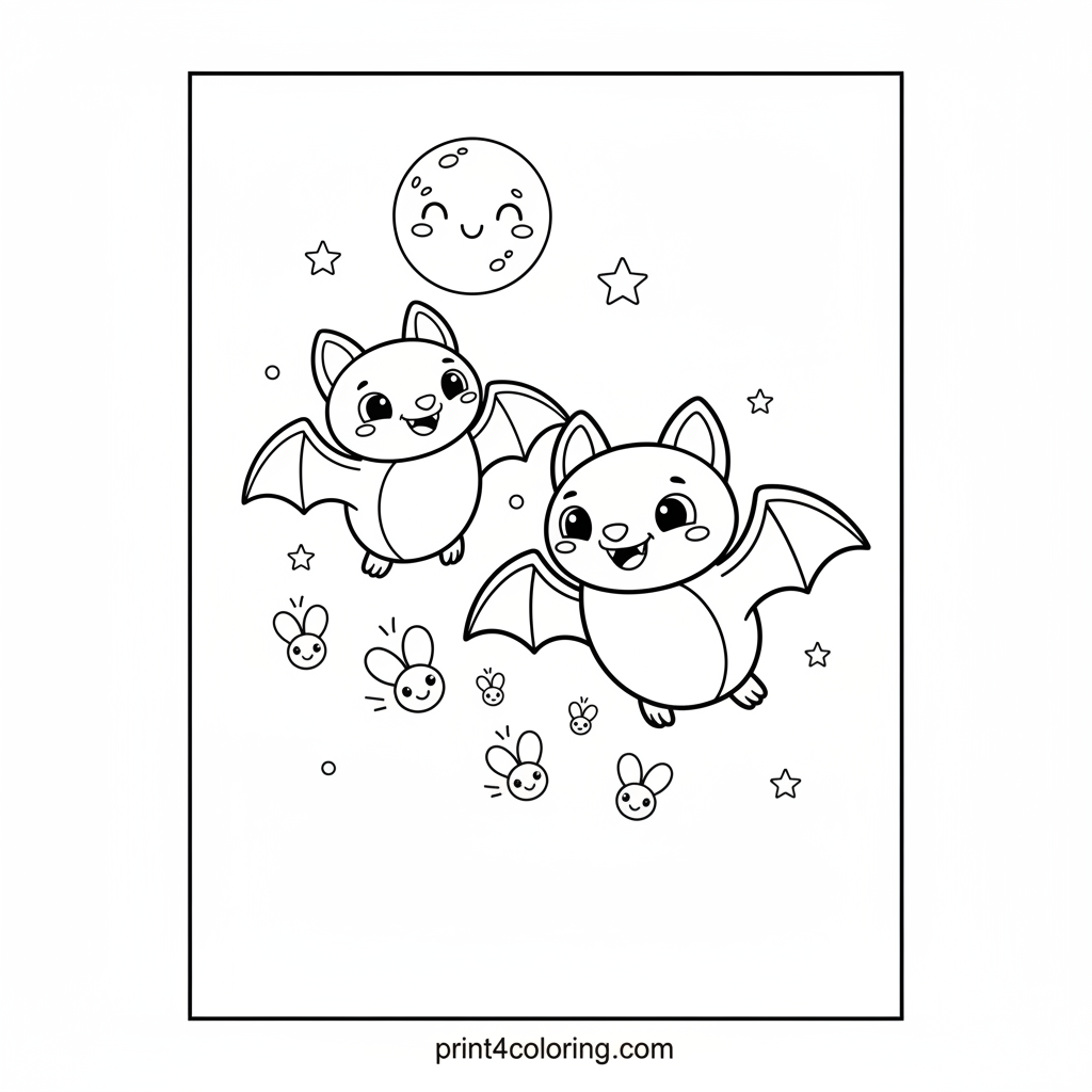 Soar into the night with two cheerful bats on a playful adventure! Watch as they gracefully fly through a luminous moonlit sky, happily chasing after a scattering of glowing fireflies. This enchanting scene invites you to add vibrant colors to the friendly nocturnal creatures and their magical surroundings.