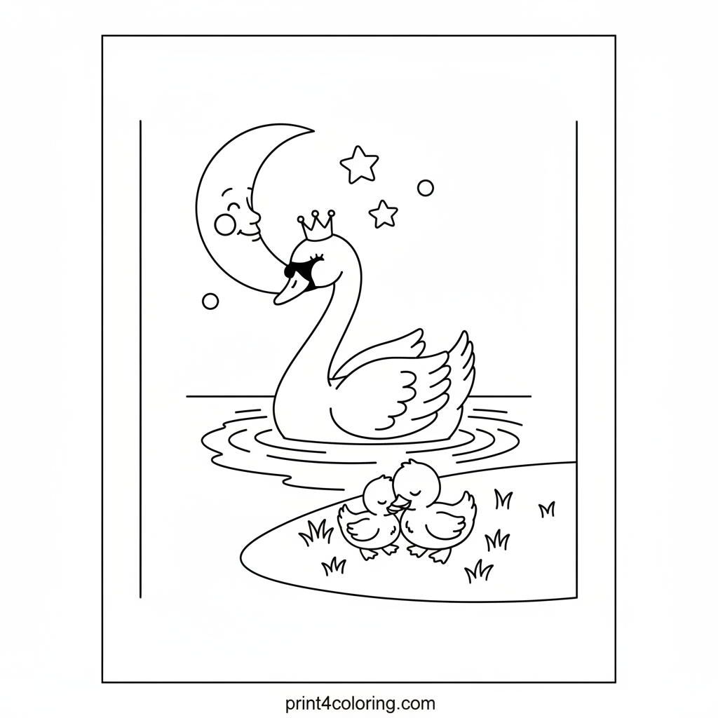 Drift into a magical night scene where a graceful swan glides peacefully under a big, friendly crescent moon and sparkling stars. Watch as it gently 'sings' a sweet lullaby to a group of sleepy, adorable ducklings nestled safely on the shore. This enchanting picture invites you to add your favorite colors to create a cozy, dreamlike masterpiece.