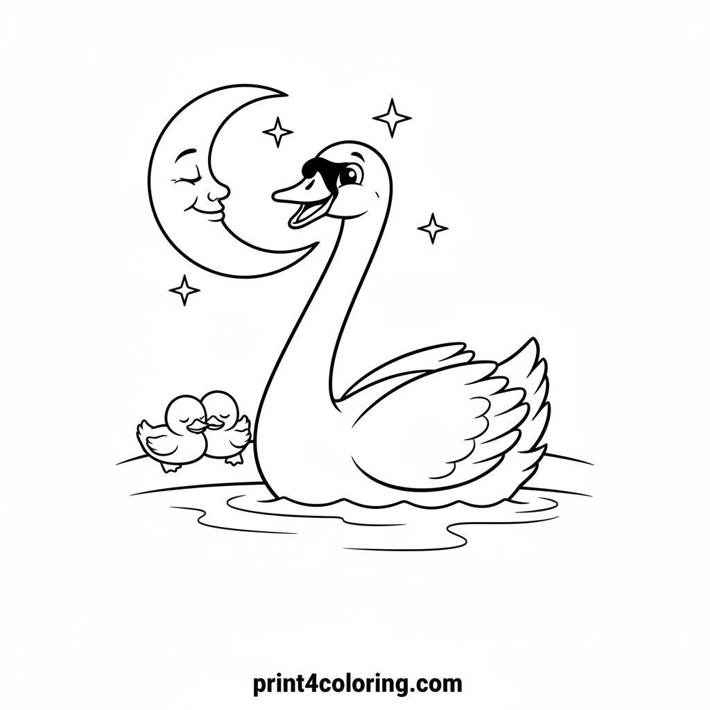 Imagine a beautiful swan gliding on calm water, bathed in the soft glow of a crescent moon. Twinkling stars sparkle above as the swan gently 'sings' a sweet lullaby. On the shore, tiny, sleepy ducklings listen to the peaceful tune. A perfect scene for quiet coloring and dreams!