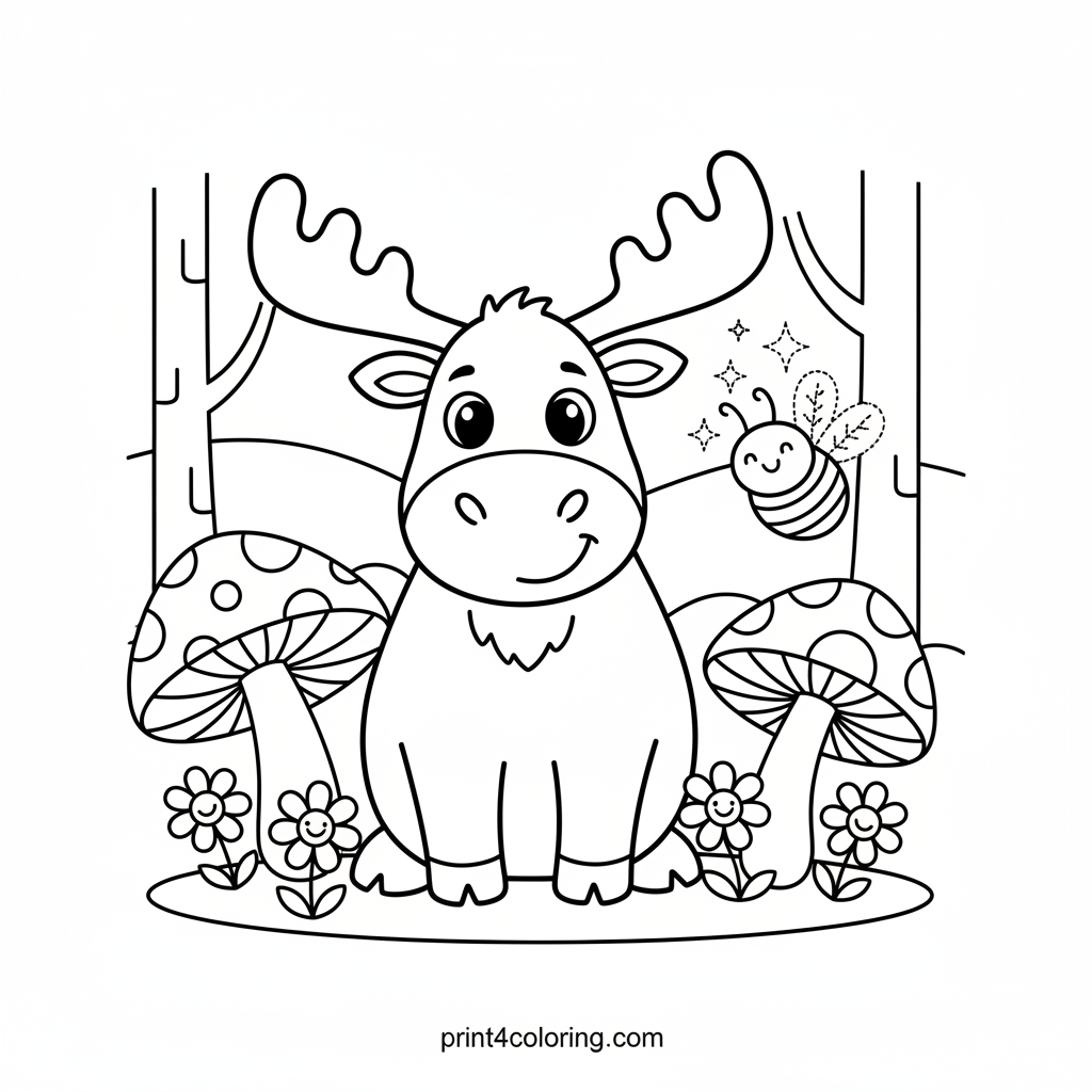 Step into a whimsical forest where a gentle moose with a friendly smile has found a sparkling new friend – a dazzling firefly! This enchanting scene features giant, simple mushrooms and happy flowers, waiting for your creative colors. Bring this magical woodland encounter to life with your favorite crayons and enjoy a peaceful adventure.