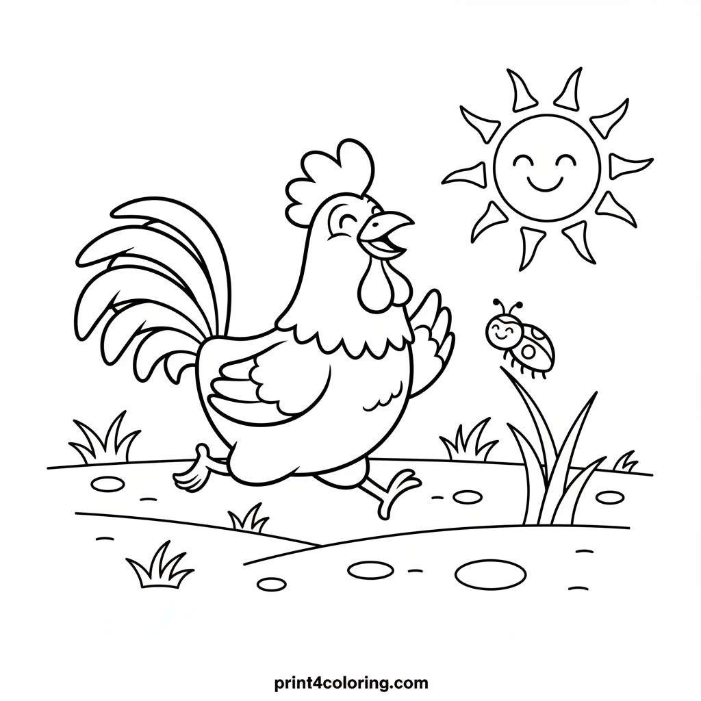 Wake up and color this happy rooster! He's enjoying a cheerful morning run through a sunny, grassy field, his feathers all ruffled from the breeze. Look closely, you might even spot a friendly little ladybug joining the fun. Get ready to bring this lively farm scene to life with your brightest colors!