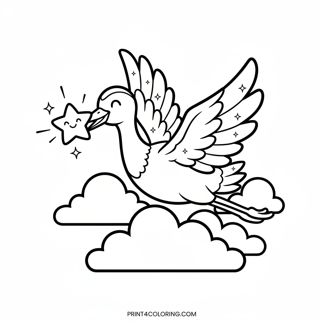 Embark on a magical journey with a gentle, mystical crane! This graceful bird soars above a fluffy cloud kingdom, its feathers softly glowing. In its beak, it carries a tiny, sparkling star, ready to light up the night. A dreamy scene perfect for young artists to color.
