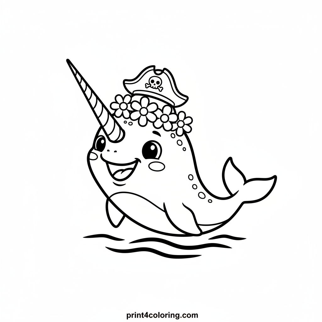 Join our cheerful narwhal for a silly balancing act! This playful unicorn of the sea is carefully stacking funny hats, including a tiny pirate hat and a flower crown, on its long tusk, all while wearing a big grin. Bring this whimsical underwater friend to life with your favorite colors!
