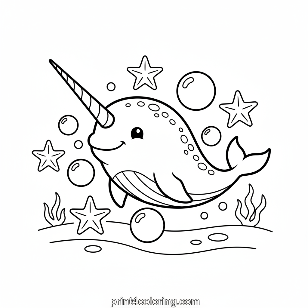 Dive into a magical underwater world where a graceful narwhal swims through a starry night! Its special tusk glows softly, guiding it past shimmering starfish lights and sparkling bubbles. This enchanting scene invites you to add vibrant colors to create a wondrous ocean dream.