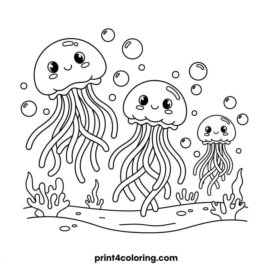 Dive into an underwater celebration with three cheerful jellyfish! Watch them gracefully twirl and 'dance' in the deep blue sea, their long, flowing tentacles swaying. Tiny, friendly bubbles float all around, adding to the magic of this joyous ocean party. Bring this bubbly dance to life!