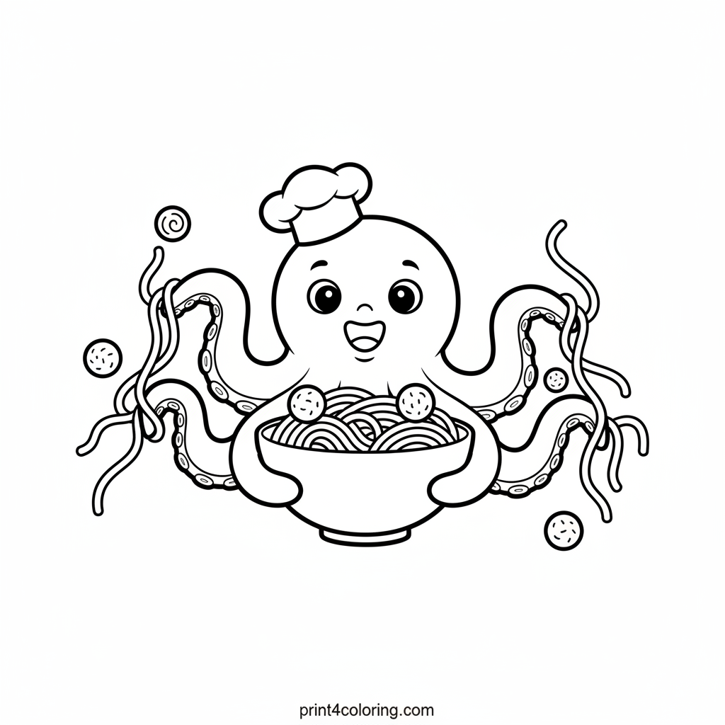 Dive into a world of delicious fun with our hilarious octopus chef! Wearing a tiny, tilted hat, this eight-armed wonder is juggling a giant bowl of spaghetti, twirling strands with each tentacle. Look at its surprised and delighted face! Get ready to add vibrant colors to this amazing culinary adventure.