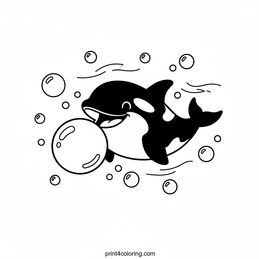 Dive into a world of underwater fun with a super silly orca! This friendly giant has a goofy grin as it playfully chases a huge, bouncy bubble. Many smaller bubbles float all around, making for a bubbly, joyful scene. Grab your crayons and bring this happy ocean moment to life!