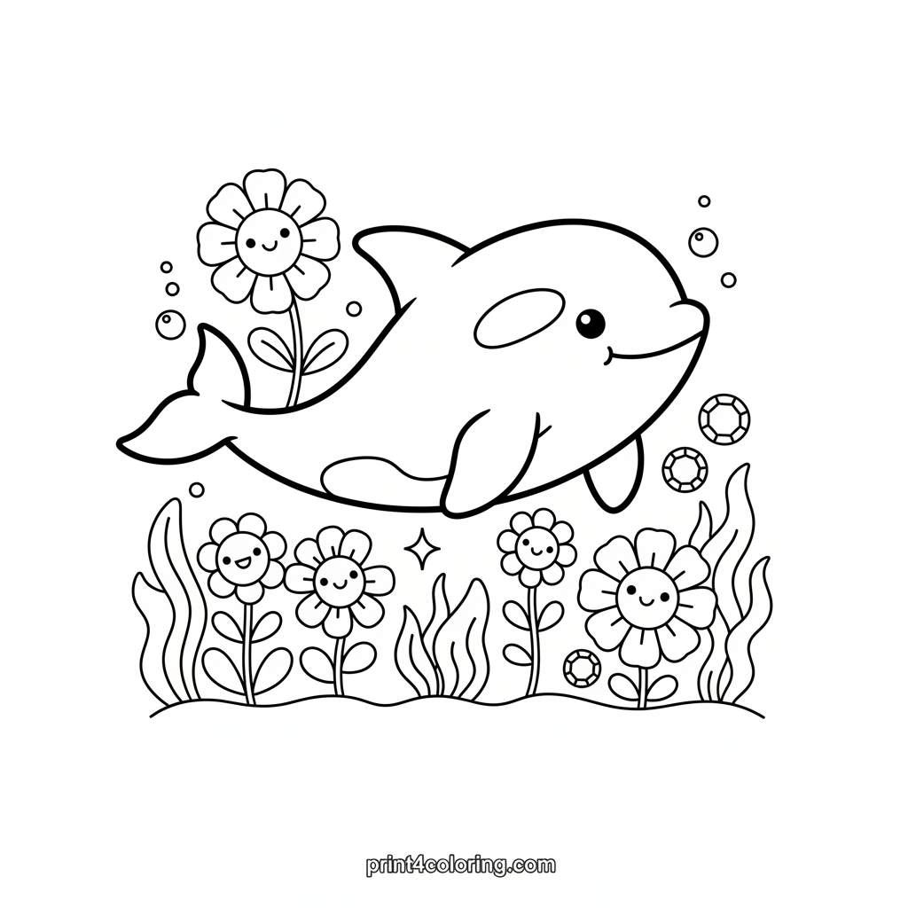 Dive into an enchanting underwater world where a friendly orca glides gracefully through a secret ocean garden! This whimsical scene features cheerful smiling flowers, happy swaying sea plants, and sparkling gems hidden among the coral. Grab your crayons and bring this vibrant, fantastical marine adventure to life with your favorite colors.
