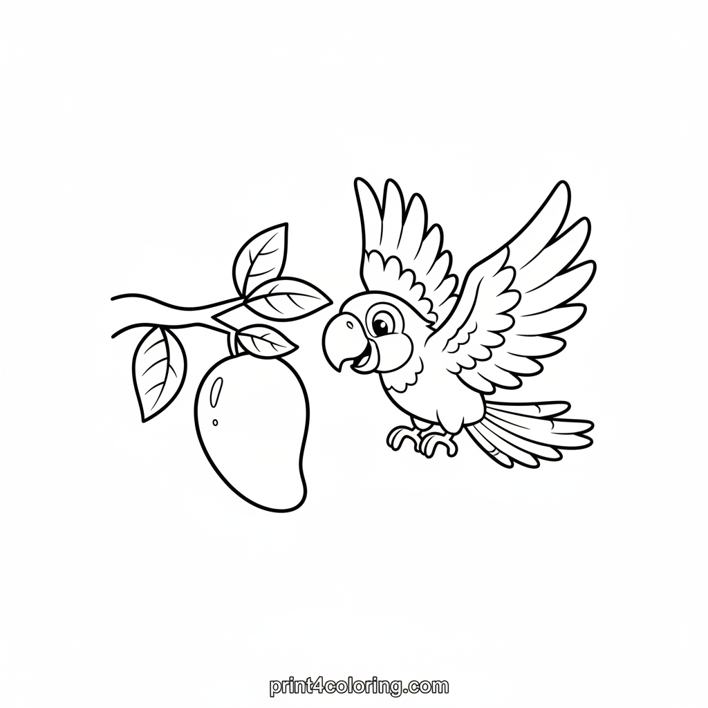Join a beautiful parrot as it takes an exciting flight through the sunny tropics! With its colorful wings spread wide, this feathered friend is gracefully soaring towards a delicious, ripe mango hanging from a leafy tree branch. Imagine the vibrant colors you can use to bring this juicy adventure to life!