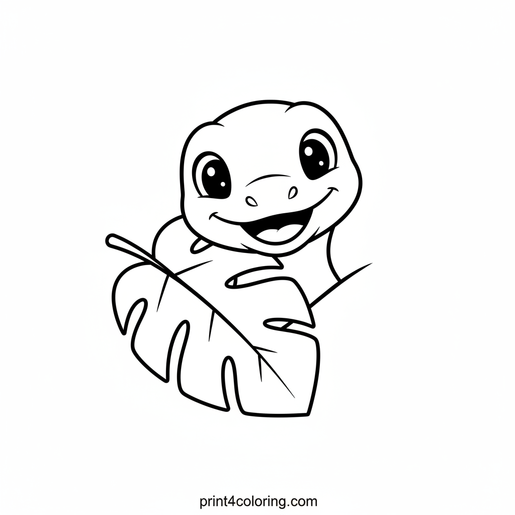 Get ready for a playful adventure! An adorable baby Komodo dragon with big, curious eyes is peeking playfully from behind a giant, friendly tropical leaf. Imagine the vibrant greens and the unique scales of this little reptile. A delightful scene for young artists to bring to life!