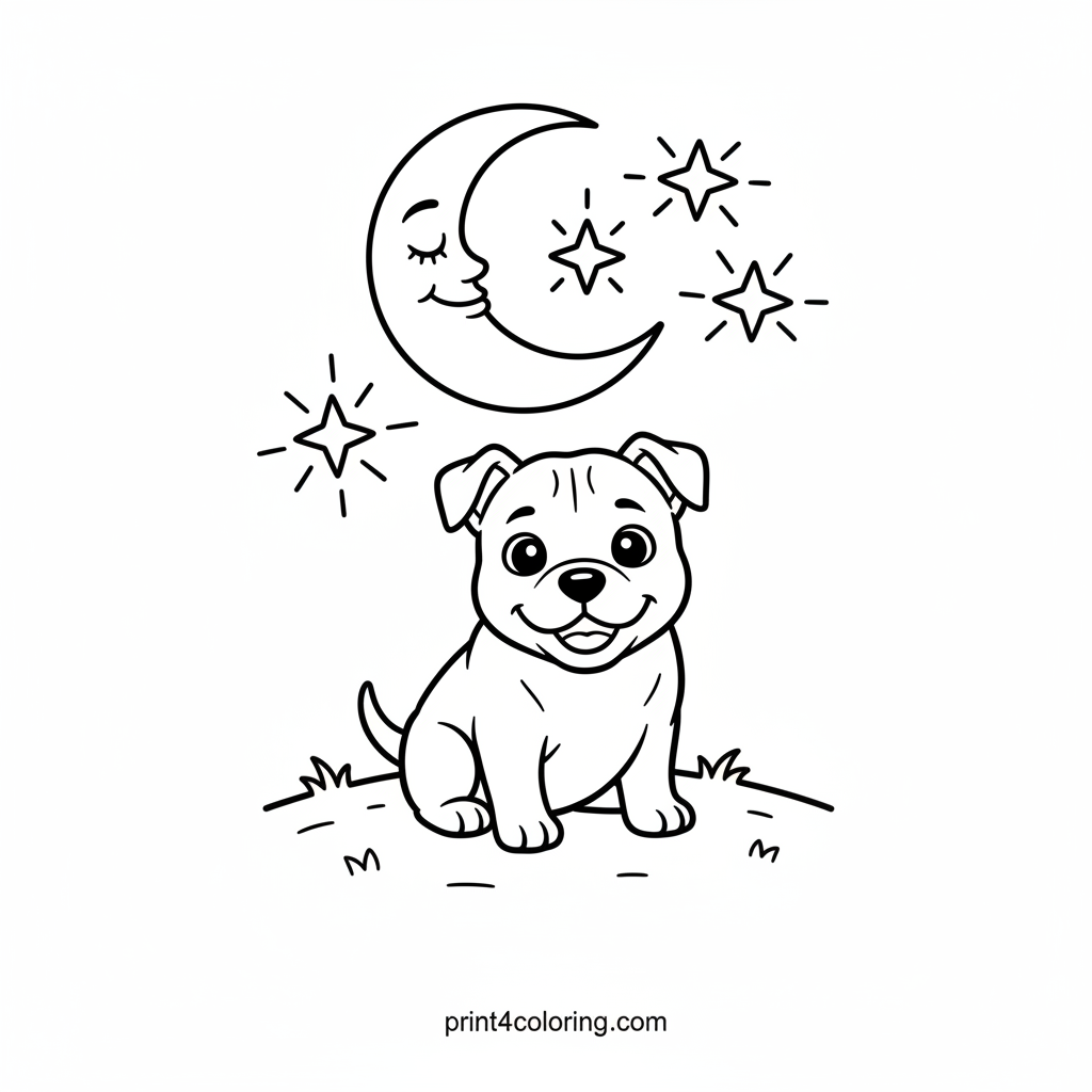Join a sweet pitbull on a quiet grassy hill, looking up at a magical night sky. Big, sparkling stars twinkle around a friendly crescent moon, making soft dreams come true. Imagine the wonderful adventures this dog is having in its sleep! This easy page is perfect for little artists.