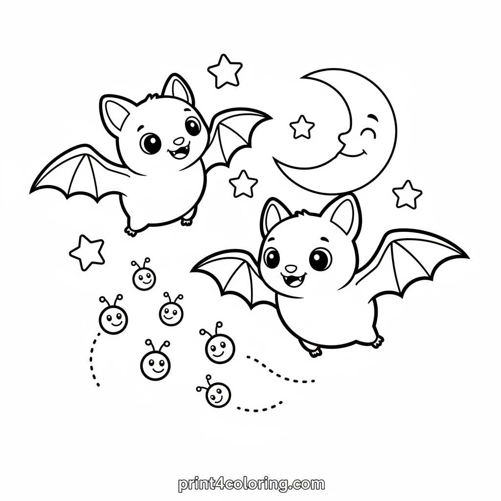 Join two cheerful bats as they soar through a magical moonlit sky! Watch them playfully chase a twinkling cluster of glowing fireflies, creating a delightful dance of light and wings. This enchanting scene is perfect for little artists to bring to life with their favorite colors, imagining a whimsical night adventure.