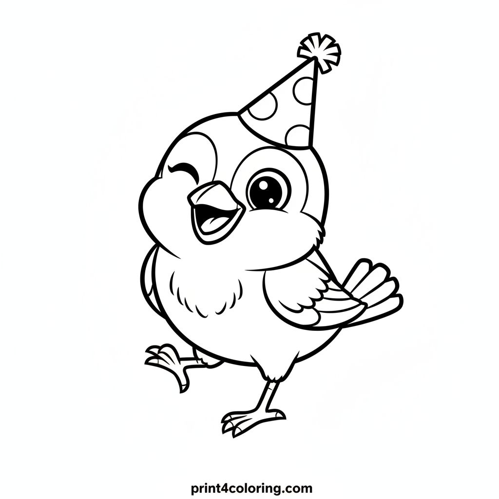 Get ready for a tiny party! This cheerful sparrow is showing off its brightest party hat, balancing on one leg, and giving a playful wink. Imagine all the vibrant colors you can use to make this little bird shine. It's a fun scene just waiting for your artistic touch to bring it to life with joy and color!