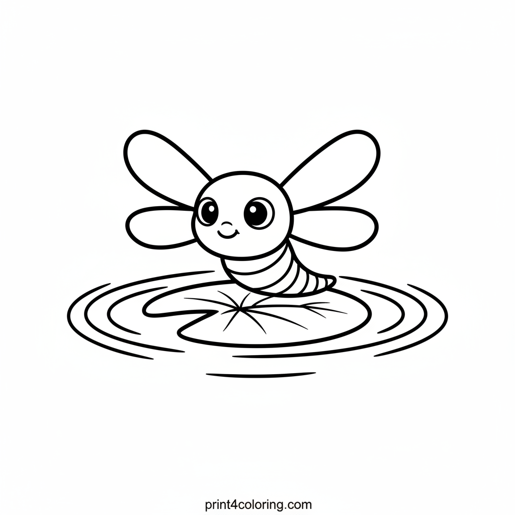 Meet our adorable, plump dragonfly friend, taking a peaceful rest on a smooth green lily pad. With big, friendly eyes, this gentle insect enjoys the calm pond, surrounded by soft water ripples. Grab your colors and bring this serene pond scene to life, imagining a sunny day by the water.