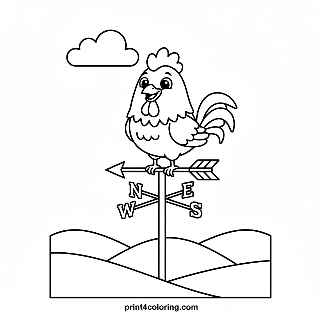 Imagine a sunny day on the farm, where a cheerful rooster proudly perches atop a classic weather vane! He's looking out over gentle rolling hills, watching the world go by. This easy coloring page invites you to bring this happy farm scene to life with your favorite colors, perfect for a peaceful afternoon of creative fun.