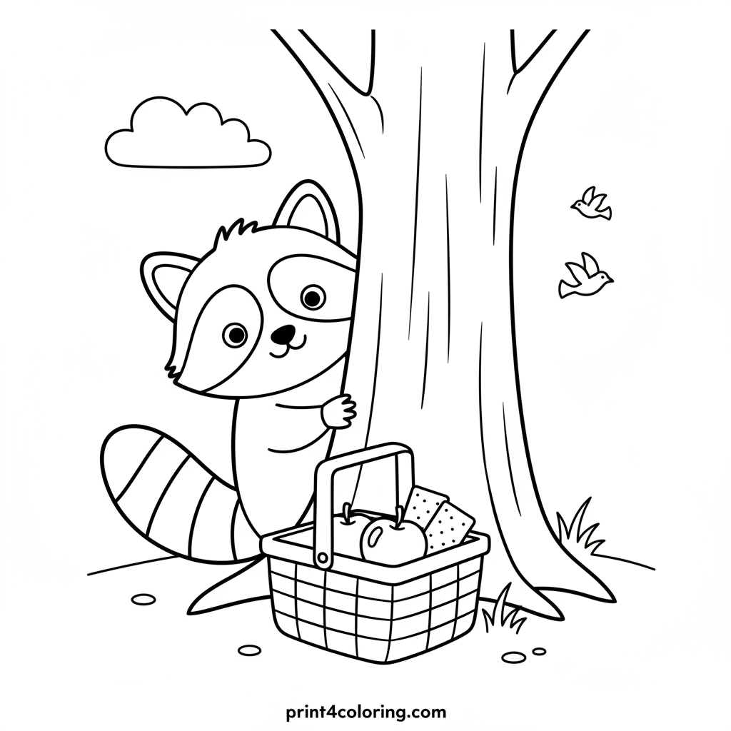 A playful raccoon is having a fantastic surprise! Peeking from behind a leafy tree, it's just discovered a yummy picnic basket overflowing with crisp red apples and tasty crackers. Imagine the fun coloring this scene as the curious raccoon decides what to nibble first!