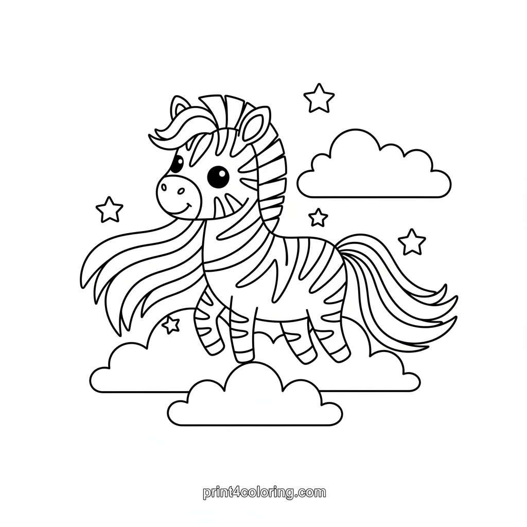 Imagine a gentle zebra with a magnificent rainbow-colored mane and tail, peacefully floating through soft, fluffy clouds. Tiny stars sparkle all around as it drifts through the dreamy sky. Get ready to add vibrant colors and bring this whimsical journey to life!