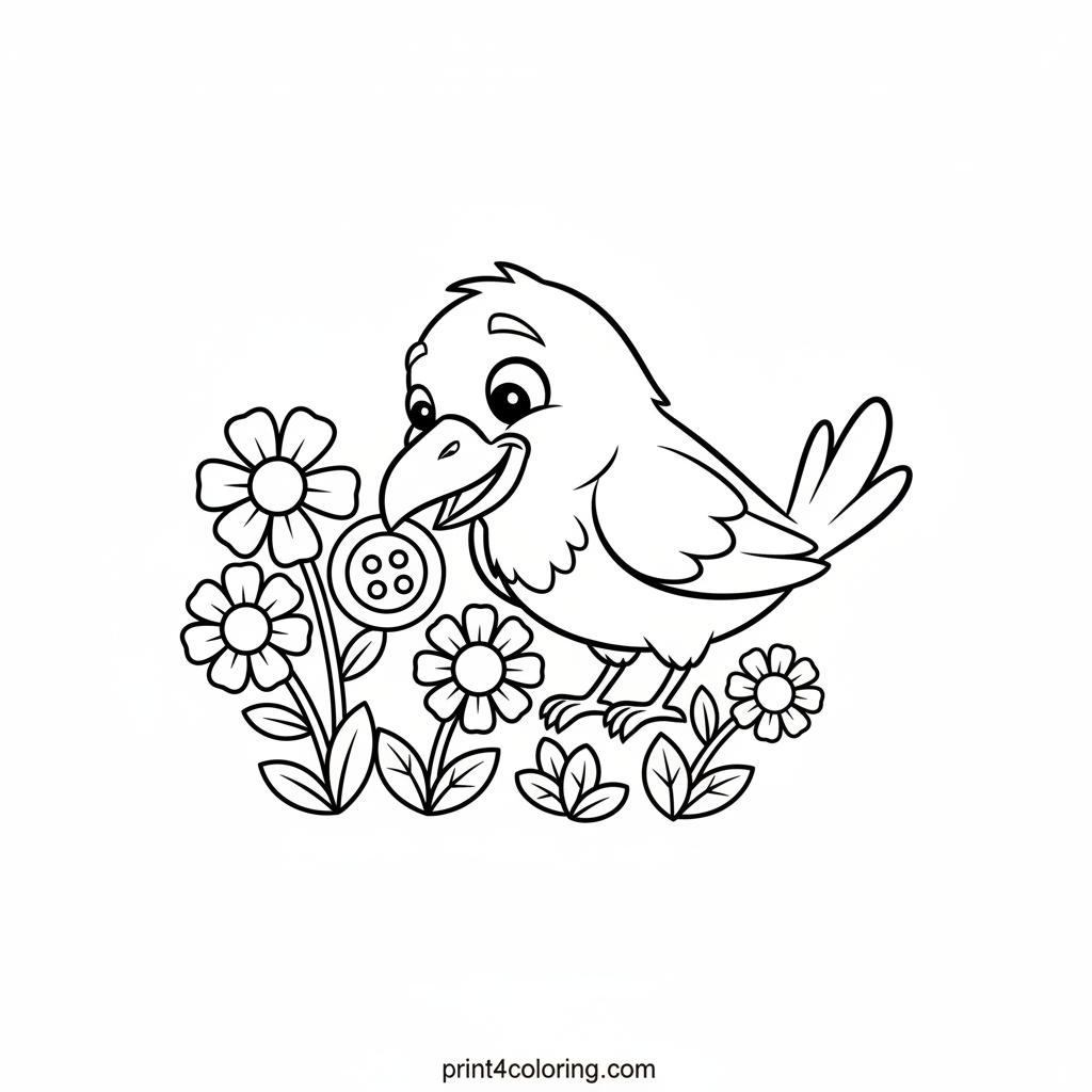 Join a clever raven on an exciting treasure hunt! This page shows a curious raven gently pecking at a sparkling button it found hidden among cheerful, blooming wildflowers. Imagine the joy on its face as it uncovers its precious, shiny find. A delightful scene for young artists to bring to life with vibrant colors!