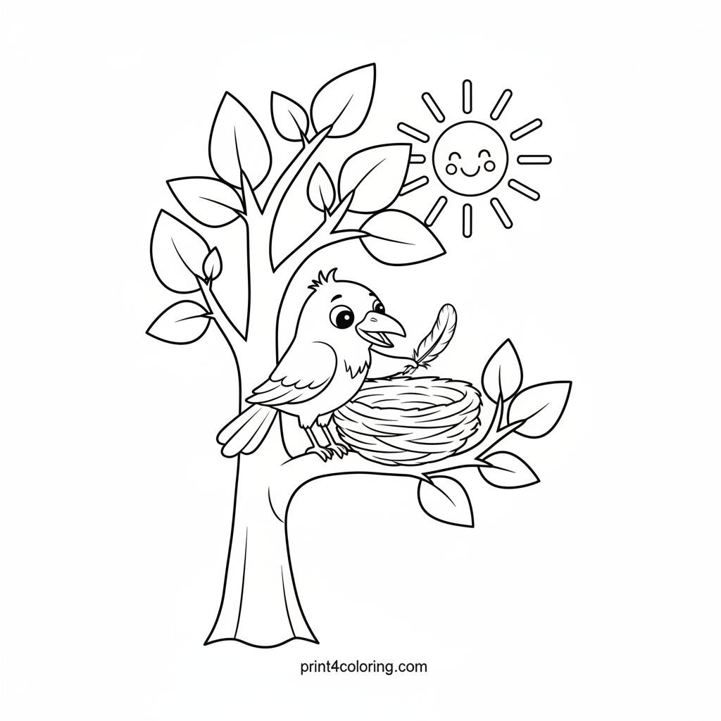 Join a diligent, happy raven as it carefully places a colorful, soft feather into its cozy, round nest. Built high in a friendly, leafy tree, the nest is bathed in bright sunshine, creating a warm and inviting scene. This easy coloring page is perfect for young artists to add their vibrant touch to nature's architecture!