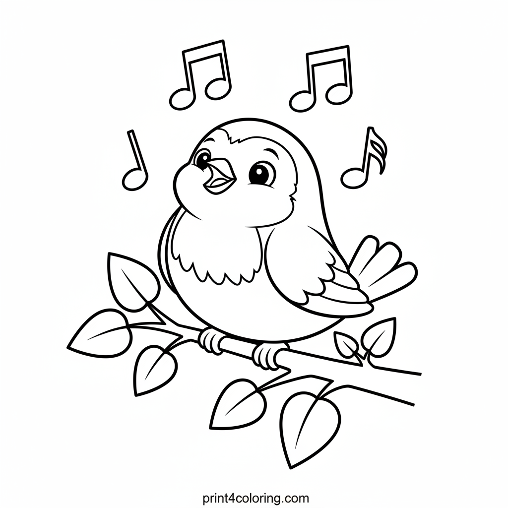 Discover a charming scene where a happy robin, head tilted back, sings its heart out on a leafy branch. Simple musical notes float in the air, inviting you to add vibrant colors to its cheerful song. Imagine the sweet sounds as you bring this delightful bird to life with your crayons!
