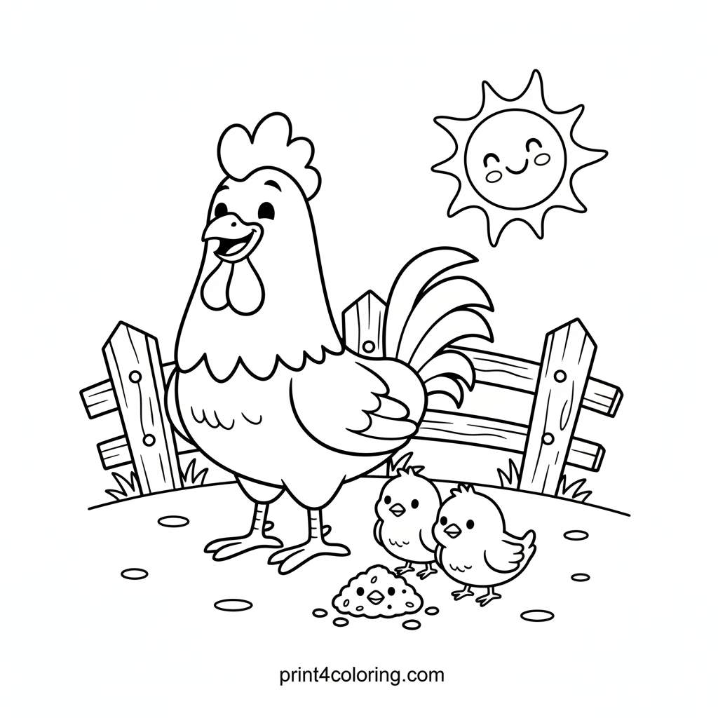 Join a friendly rooster and his two adorable, fluffy chicks as they share a delicious pile of happy seeds in a bright, sunny barnyard! This heartwarming scene is perfect for little artists to bring to life. Imagine the warm sun, soft feathers, and the joy of farm friends sharing a meal.