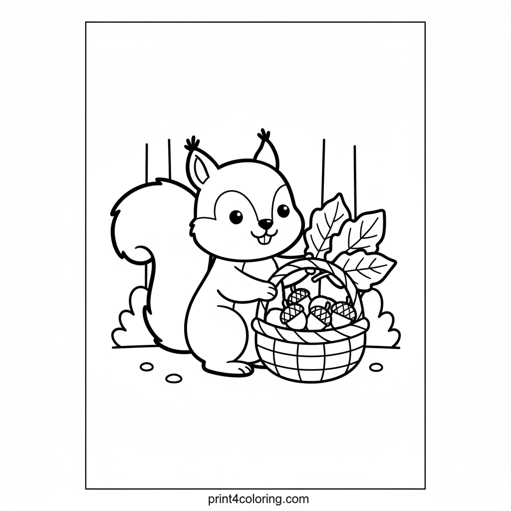 Join our cute little squirrel as it busily gathers a colorful autumn harvest! Watch it collect plump acorns and vibrant leaves into its whimsical basket, getting ready for the cozy winter ahead. This happy forest scene is perfect for little artists to bring to life with their favorite fall colors.