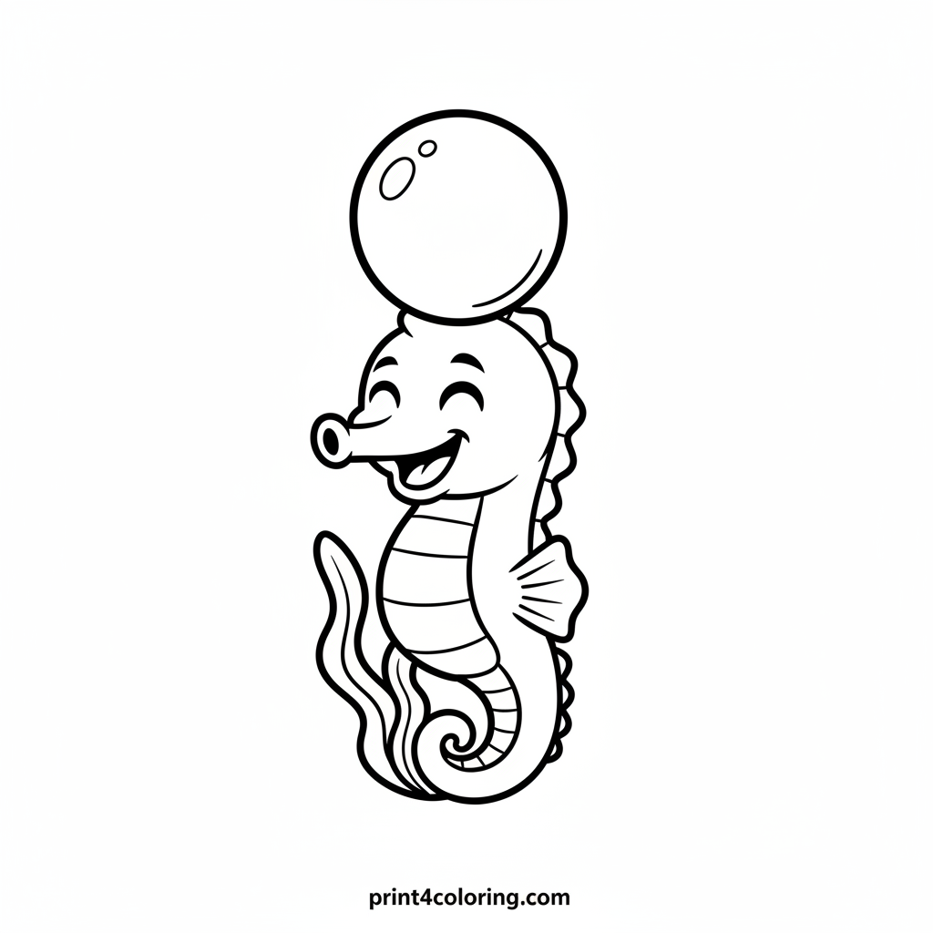 Dive into a whimsical underwater world! This adorable coloring page features a happy, giggling seahorse balancing a perfectly round, giant bubble on its head like a hat. Holding onto a piece of wavy seaweed, this charming sea creature is ready for you to bring its bubbly adventure to life with your favorite colors.