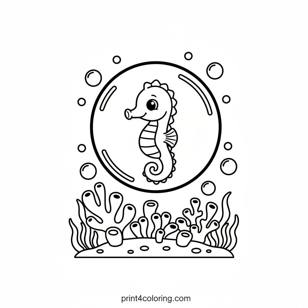 Dive into a wondrous underwater world! A cheerful seahorse with sparkling fins gently rides a magical, glowing bubble through an enchanted garden. Discover whimsical plants and soft, shimmering light, ready for young artists to bring to life with their favorite colors and imagination!