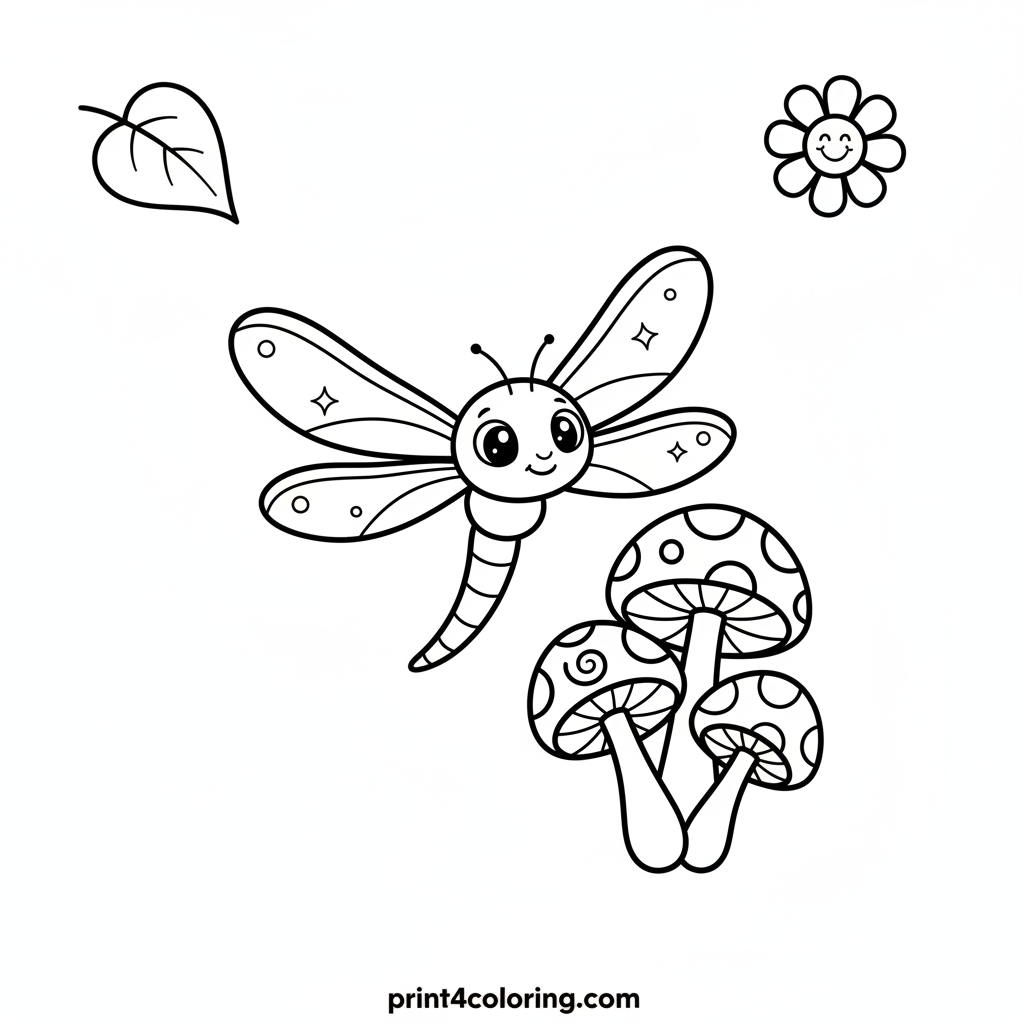 Dive into a magical world where a beautiful dragonfly with shimmering, transparent wings hovers gracefully. It's surrounded by fantastical, glowing mushrooms and whimsical plants in a peaceful garden, waiting for your colors to bring it to life. Imagine the magic!