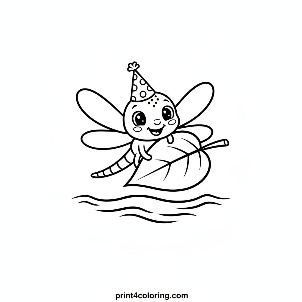 Join a cheerful dragonfly on a whimsical river adventure! This happy bug wears a tiny, comical hat, holding onto a large, floating leaf. Imagine it gently drifting down a tiny, imaginary river, enjoying a peaceful ride. What vibrant colors will you choose for this silly scene?