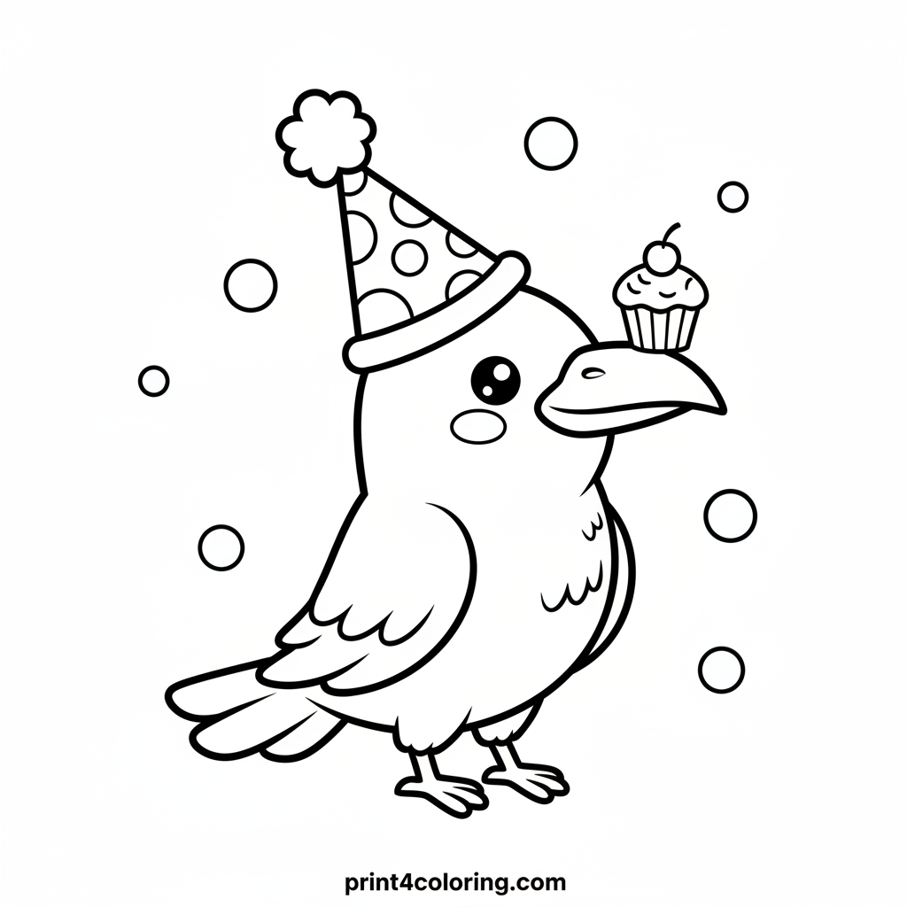 Meet our cheerful raven, ready for a party! This silly bird is wearing a comically oversized, colorful hat. Look closely as it balances a tiny cupcake on its beak with a joyful, slightly wobbly expression. A delightful scene perfect for little artists to bring to life with bright colors!