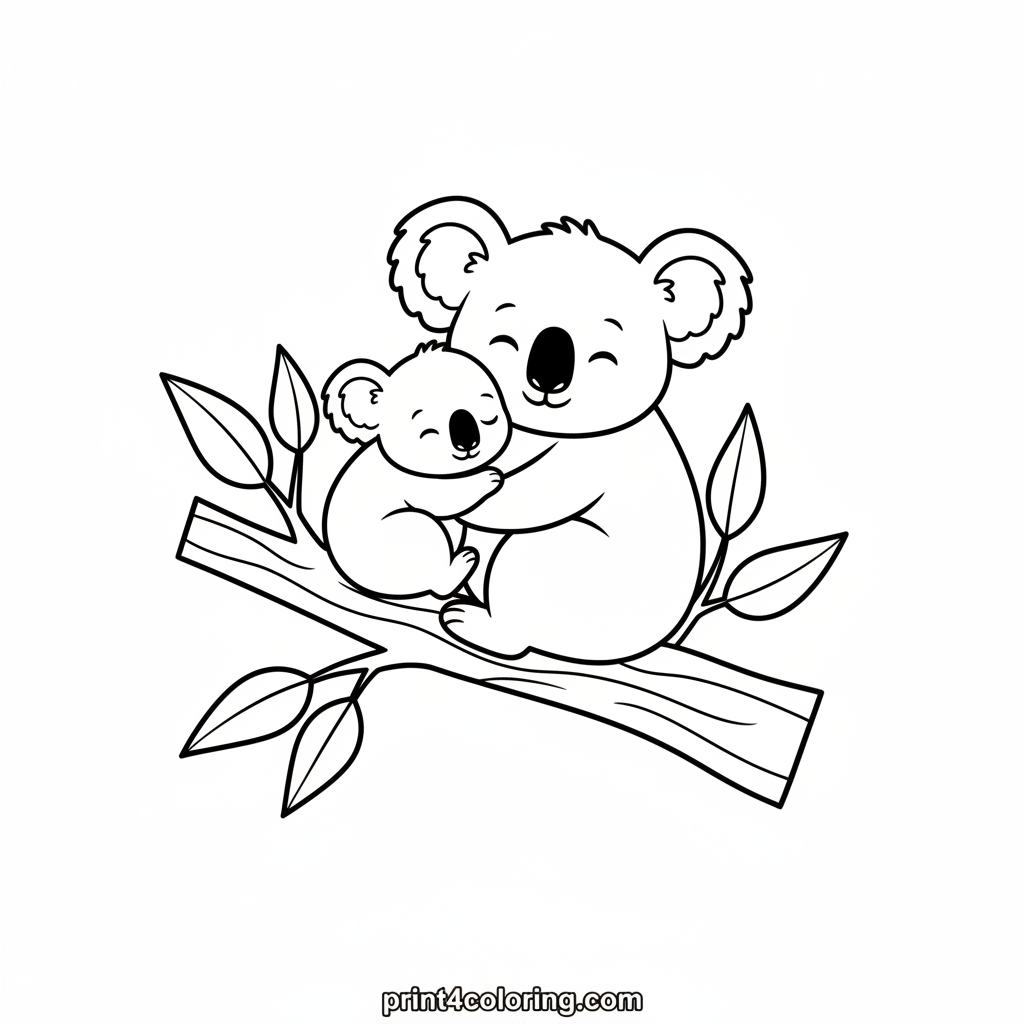 Snuggle up with this sweet coloring page featuring a sleepy baby koala, or 'joey,' napping soundly on its parent's back. Perched high in a eucalyptus tree, these adorable marsupials are enjoying a peaceful moment. Grab your crayons and bring this heartwarming scene to life with soft colors and leafy greens!