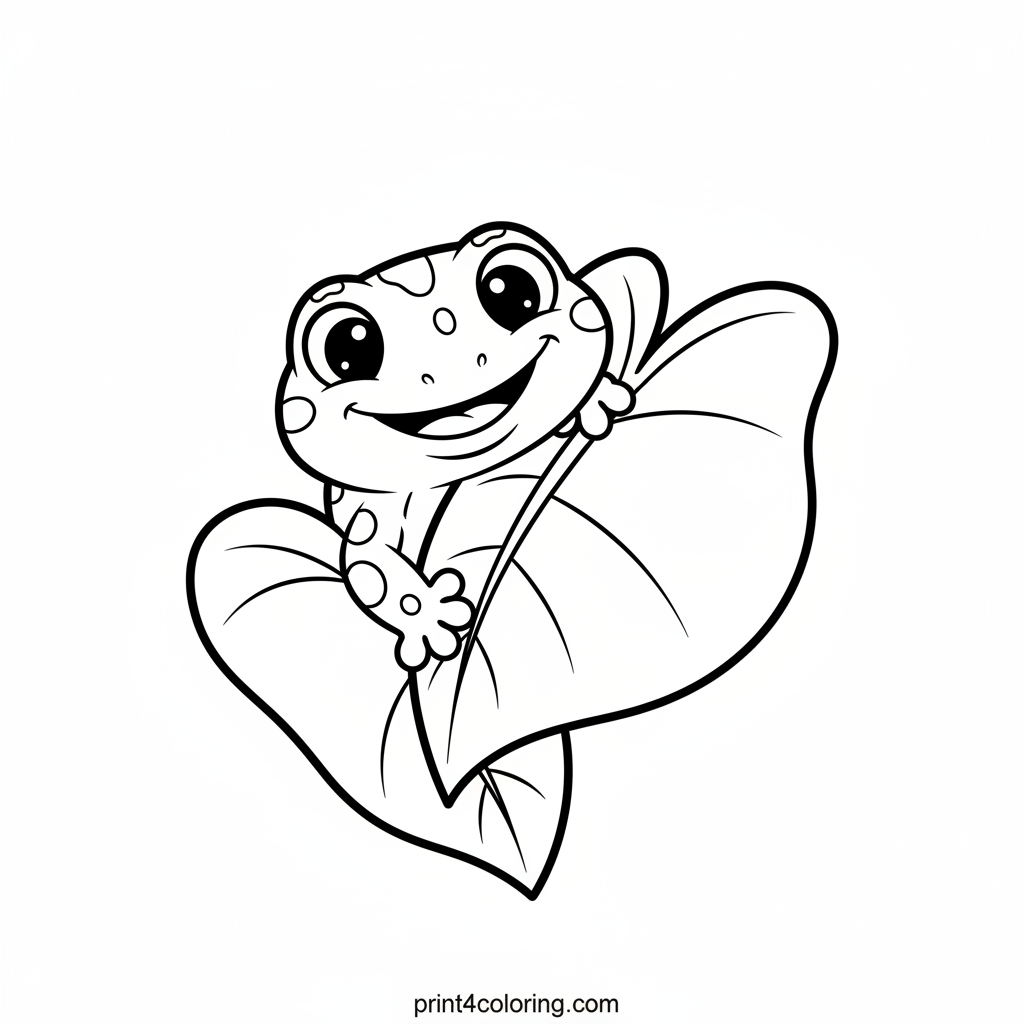 Discover a delightful gecko with a big smile, playfully peeking from behind a large tropical leaf. Its wide, friendly eyes invite you to bring this charming scene to life! Use your favorite colors to shade its unique scales and the lush jungle greenery, creating a vibrant, happy picture.
