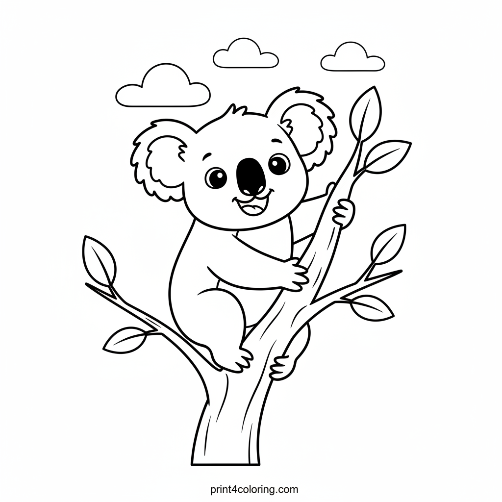 Meet a super happy koala with a big smile, actively climbing a sturdy eucalyptus branch! This adorable marsupial is reaching out a paw for a fresh, tasty leaf. Imagine the beautiful colors you can use for its soft fur and the strong tree. Get ready for a fun coloring adventure!
