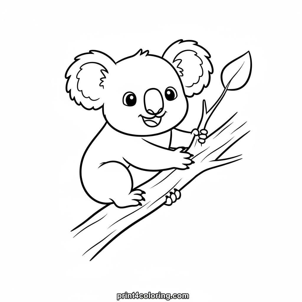 Get ready to color a super cute koala on a fun adventure! This happy koala, with a big smile, is busily climbing a strong eucalyptus branch. Watch as it reaches out a paw to grab a yummy, fresh leaf. Bring this playful scene to life with your favorite colors and imagine the koala enjoying its leafy snack!